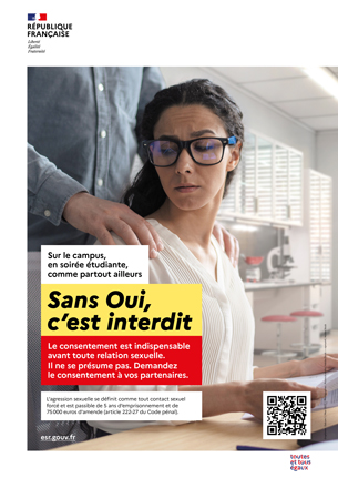 Afin de sensibiliser la communauté universitaire dans la lutte contre les VSS, l'Université relaie sur ses campus la campagne nationale de communication sur le consentement lancée par le ministère de l'enseignement supérieur et de la recherche et conçue en partenariat avec l’association Sexe & Consentement.